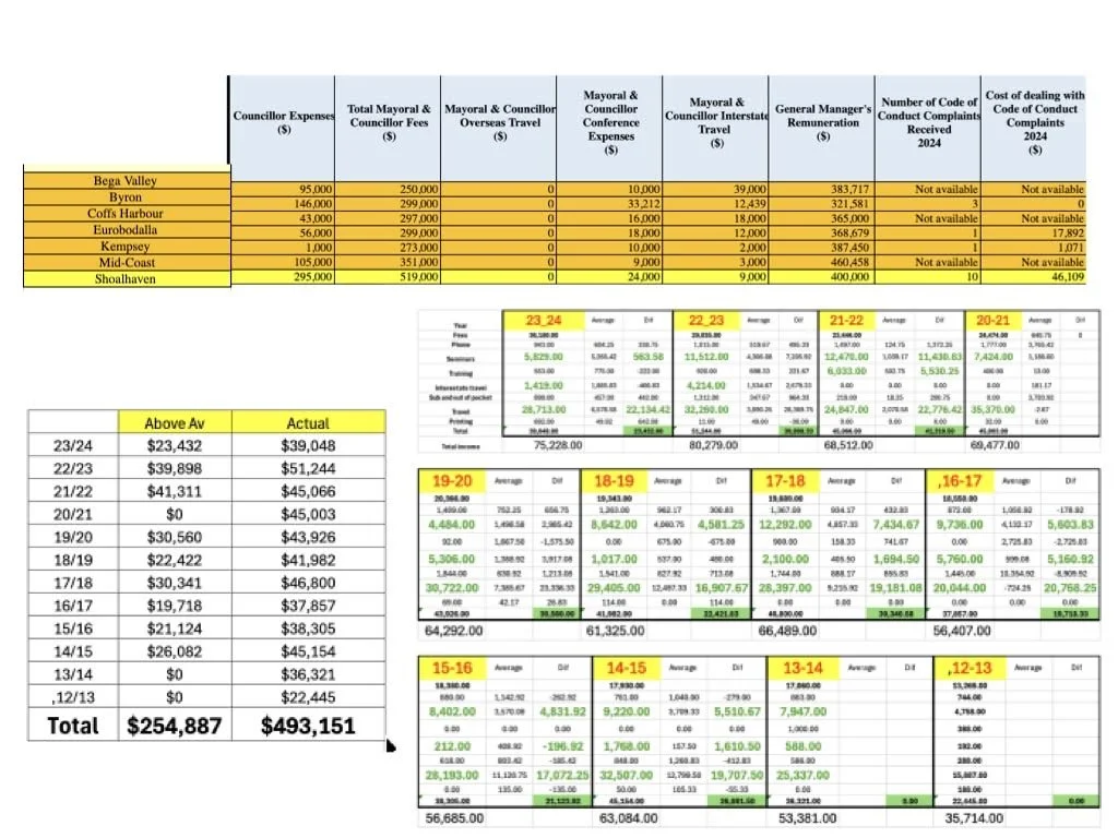 Shoalhaven over double the next council (Byron) in councillor expenses and comes in as the biggest spender on Mayoral and Council fees.