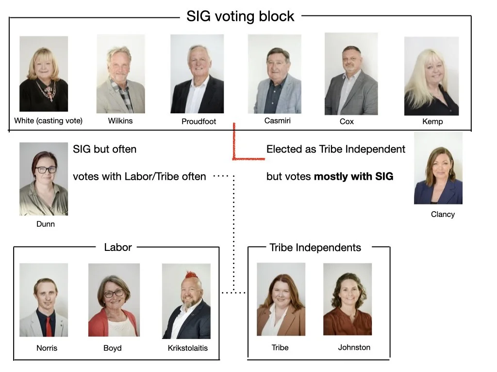 Team Tribe Independents (TTI): 3 councillors - however, almosts from the first meeting Councillors Clancy split from the Tribe group and has offered full support to SIG. So they are down to 2